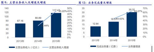 注: 因為順豐在最新年報中沒有給出詳細的國內快遞業(yè)務(時效產品)的件量數(shù)量。只給了一個總體25.8億票和31%的增速,前后口徑應不同,所以2016年份額反增加。但不影響結論。若按2015年占比為8.22%,若16年件量增速31% ,份額實際已降至1.31/1.5*8.22%=7.1%左右。