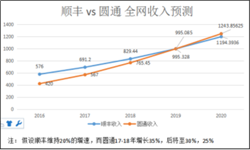 順豐全網收入份額一度達20%。但隨著增速落后逐年下滑,很可能要失去老大地位。圓通申通單票運費是順豐的1/2,只要件量是順豐的2倍。就有可能超過順豐。2016年2月圓通老板娘張小娟在杭州兩會上透露圓通2015年總件量約35億件(實際30億票),全網營收350億元(實際可能為300億元)。根據(jù)圓通發(fā)布的業(yè)績預告,2016年件量和收入都大于40%的增長。全網收入可能超420億元。假若保持這種趨勢下去,圓通甚至中通、申通等都可能在接下來三五年內在全網收入上超越順豐, 甚至比順豐提早突破千億大關。順豐可能掉至三四名甚至更后。