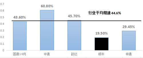 順豐在2016年的國內快遞業(yè)務(時效產品,不包括其重貨、冷運、倉配業(yè)務,這些也未計入郵政局快遞統(tǒng)計)收入增速只有15%左右。整體收入增速19.5%也遠遠落后于行業(yè)同期的44.6%。回看近年數(shù)據(jù),其增速早與行業(yè)脫節(jié),且差距拉大。在2016年低于行業(yè)25個點,低于申通圓通一半,不足中通1/3。