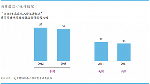 2015年調查數(shù)據(jù)顯示,55%的家庭認為未來五年家庭收入將會顯著提高,而英國和美國在2011年時的數(shù)據(jù)僅為32%和30%。