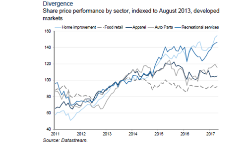 零售商大批破產(chǎn)的同時,一些對電商“免疫”的行業(yè),在過去幾年表現(xiàn)卻明顯優(yōu)于其他消費(fèi)類行業(yè)。高盛在一篇報(bào)告中總結(jié)了以下四類:1、線下體驗(yàn)型消費(fèi)(如游樂場);2、“大件”商品和服務(wù)(如家具、教育);3、B2B類商品(如工業(yè)零件);4、有監(jiān)管約束的商品(如藥品)。