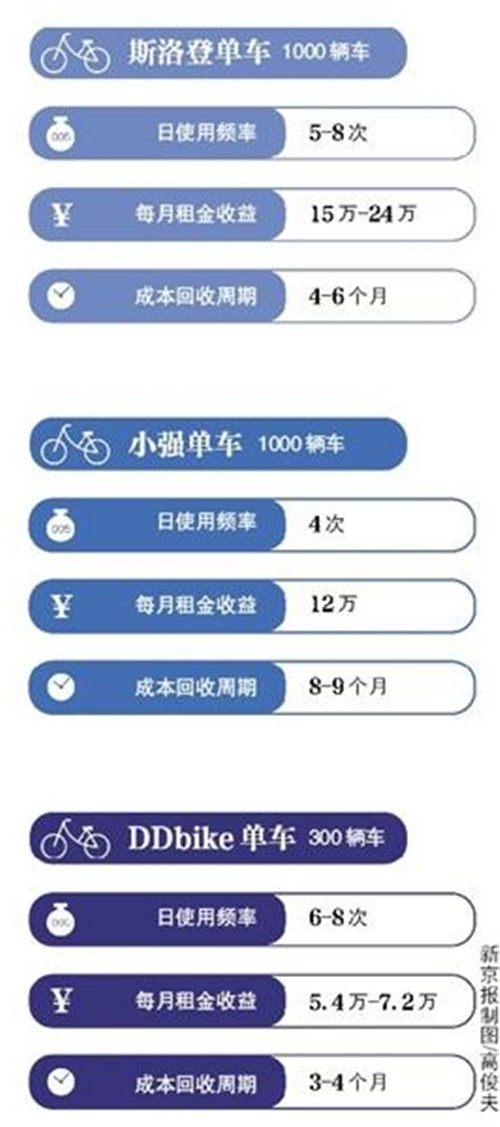 另一個(gè)來自成都的DDbike則稱,以15萬(wàn)人口的縣城為例,投放300輛車,資金約13.8萬(wàn),客戶端軟件的使用費(fèi)用3萬(wàn),成本總計(jì)18萬(wàn)元,每輛車的日均使用頻率為6-8次,以此計(jì)算3至4個(gè)月就可收回投資本金。