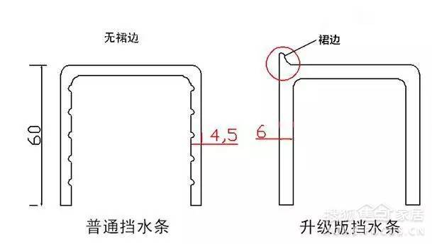 有些賣(mài)家吹噓有裙邊的擋水條有多好,實(shí)際上是誤導(dǎo)消費(fèi)者。有裙邊的擋水條實(shí)際上是用在帶玻璃的淋浴房下面做石基用的,玻璃是放在擋水條中間的,裙邊是防止水從玻璃下滲入擋水條。