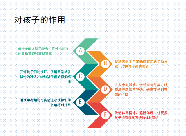 “趣味親子運動趴”根據(jù)孩子年齡不同設置指標,由家長和孩子共同參與、相互協(xié)作完成,是一次從耐力到動手能力、反應力到創(chuàng)造力,速度與平衡全面考量的一系列親子活動,從“歡樂親子跑”到“趣味體能大沖關”,不但提高幼兒的活動技能,開拓孩子們的視野,增加孩子們的探索精神,增強少年兒童的身體素質的,又寓教于樂,有利于孩子們身心健康成長,同時讓家長們也了解正確而有趣的運動方式,更好的增進父母與孩子間感情。