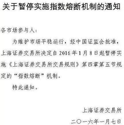 1月7日當(dāng)晚,上交所、深交所及中金所聯(lián)合發(fā)布通知稱決定暫停實(shí)施制度熔斷機(jī)制。“經(jīng)中國證監(jiān)會(huì)同意,上交所、深交所及中金所決定于1月8日起暫停實(shí)施指數(shù)熔斷相關(guān)規(guī)定。”