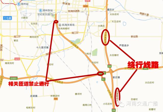 原由鄭州機(jī)場高速進(jìn)入鄭州市區(qū)方向車輛繞行京港澳高速公路、四港聯(lián)動(dòng)大道或其他道路通行。屆時(shí)機(jī)場高速公路與航海路互通、西南繞城互通、機(jī)場互通的相關(guān)匝道將禁止通行。