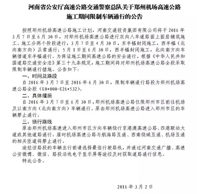 自2016年3月7日至6月30日,鄭州機(jī)場高速公路僅限鄭州市區(qū)前往機(jī)場及以南方向(北向南方向)車輛通行。原由鄭州機(jī)場高速公路進(jìn)入鄭州市區(qū)的車輛禁止通行。