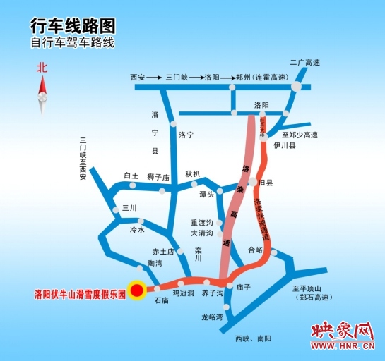 1、 洛陽(yáng)—洛欒高速—欒川縣下高速—欒川石廟鎮(zhèn)—伏牛山滑雪度假樂(lè)園(140公里)
