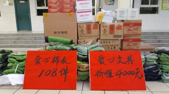 這次活動(dòng)我們聯(lián)合愛心企業(yè)捐助了108套棉衣、價(jià)值4000余元的文具和生活用品。