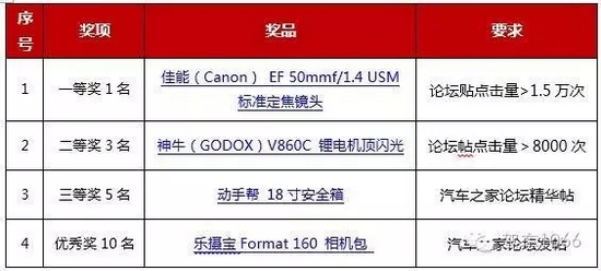為了滿足眾多攝影愛好者和車迷們的拍攝需求,中原國際車展聯(lián)合攝影愛好者協(xié)會共同舉辦“中原國際車展汽車攝影大賽”。只要你愛車、喜歡拍照,就可以報(bào)名參賽!此外,在汽車之家發(fā)布論壇帖可以獲得大獎(jiǎng)喲~