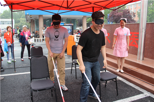 義診活動現(xiàn)場,還舉行盲人體驗活動,邀請市民戴上眼罩模擬盲人參加各種游戲,以體驗健康視力的寶貴。