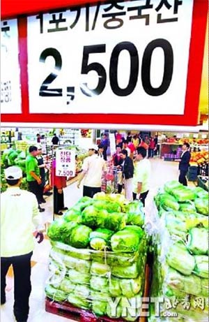 進(jìn)入10月以來(lái),作為韓國(guó)的“國(guó)菜”泡菜用的原料大白菜價(jià)格出現(xiàn)了暴漲的情況。在首爾,超市里一棵白菜的價(jià)格一度達(dá)到了1.5萬(wàn)韓元(約合人民幣89元)。為了平抑菜價(jià),韓國(guó)政府緊急從中國(guó)進(jìn)口免關(guān)稅的大白菜救急。記者昨日在韓國(guó)首爾的樂(lè)天連鎖超市了解到,在每人限購(gòu)3棵的情況下,中國(guó)大白菜在開(kāi)業(yè)后30分鐘左右就已售罄,超市已決定從中國(guó)追加進(jìn)口10萬(wàn)棵白菜。