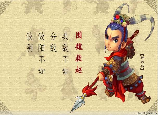 譯文:攻打兵力集中的敵人,不如設(shè)法使它分散兵力而后各個擊破;正面攻擊敵人,不如迂回攻擊其薄弱空虛的環(huán)節(jié)。本指圍攻魏國的都城以解救趙國。后指襲擊敵人后方的據(jù)點以迫使進攻之敵撤退的戰(zhàn)術(shù)?,F(xiàn)借指用包超敵人的后方來迫使它撤兵的戰(zhàn)術(shù)。