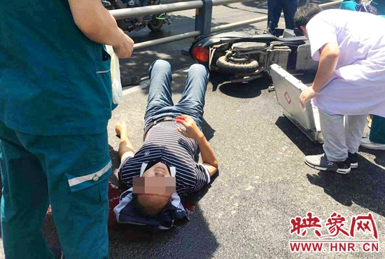 5月27日上午,鄭東新區(qū)平安大道商務(wù)外環(huán)路口附近,一年輕男子騎著電動(dòng)車上班,因?yàn)闉⑺噭偨?jīng)過(guò)路面濕滑,男子不慎摔倒著地,頭部重傷造成大量出血。