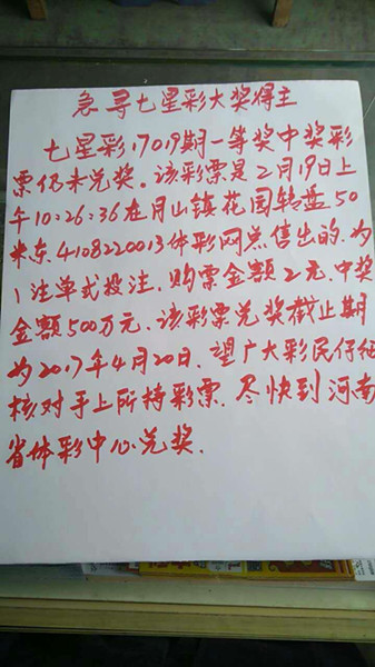 大獎中出之后,中獎人一直沒有到河南省體彩中心兌獎,而60天的兌獎有效期卻在一天一天流逝,眼看2017年4月20日的最后兌獎期限將至,為了更好的保護彩民利益,省體彩中心自2017年4月6日開始,通過省市網絡、報紙、廣播、官微、體彩銷售網點廣播消息和尋人啟事等多種形式發(fā)布消息,努力尋找和提醒中獎得主。