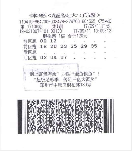 王先生的中獎(jiǎng)彩票是一張120元的前區(qū)2膽6拖后區(qū)3碼的膽拖票。