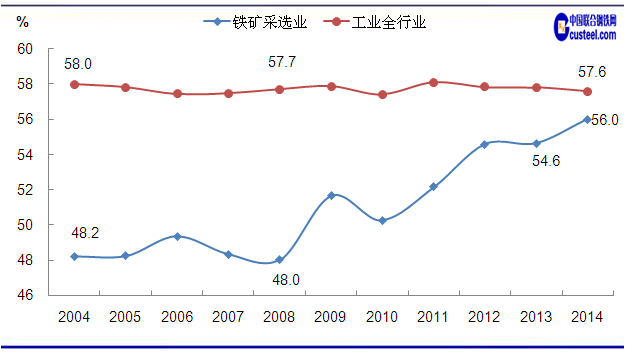 圖4 2004-2014年鐵礦采選業(yè)及工業(yè)全行業(yè)資產(chǎn)負(fù)債率變化走勢(shì) 數(shù)據(jù)來(lái)源:中國(guó)統(tǒng)計(jì)局