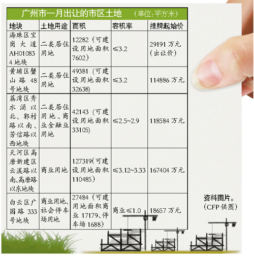 而根據(jù)以往數(shù)據(jù),廣州1月底即將入市的土地達到7宗,總起拍價高達55.8億元,其中有五宗地位于中心城區(qū),備受關(guān)注。記者發(fā)現(xiàn),去年1月廣州土地出讓金僅為13.6億元。若以起拍價計算,廣州今年1月拍地收入將達到去年同期4倍。
