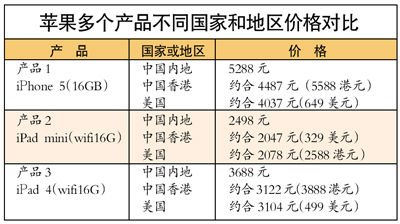 另外,剛剛上市的iPad mini,其wifi版的16G在美國市場僅為2047人民幣(329美元),大大低于中國內(nèi)地市場同款式的2498元人民幣。即使與前幾代價(jià)格沒有變化的ipad 4,其16G的wifi版在美國也只要3104元人民幣(499美元),中國香港市場為3122元人民幣(3888港元),而中國內(nèi)地市場卻要3688元人民幣。