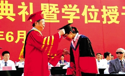 鄭州大學校長劉炯天在畢業(yè)典禮上為學子撥穗