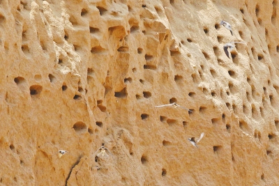 記者在現(xiàn)場(chǎng)看到,堆壁上崖沙燕的小洞穴似拳頭大小,密密麻麻,難以數(shù)清。天空中,不少小燕子正在“苦練”飛翔,嘰嘰喳喳的鳴叫聲此起彼伏;洞穴里,嗷嗷待哺的燕寶寶好奇地伸頭張望,透過攝影記者的長(zhǎng)鏡頭,記者觀察到,好多洞穴內(nèi)還有燕子喂食小燕的暖心畫面。