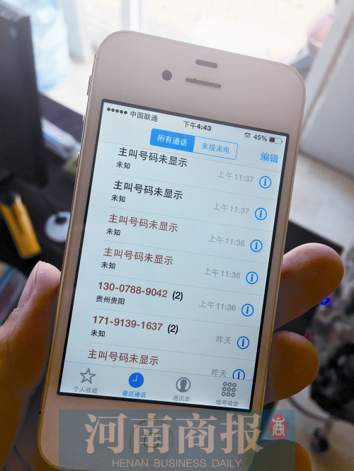 記者從夏先生的通話記錄上看到,除了主叫號(hào)碼未顯示、歸屬地未知的來(lái)電外,其余的來(lái)電來(lái)自廣東、安徽、貴陽(yáng)等全國(guó)各地,且每個(gè)號(hào)碼也都不一樣。