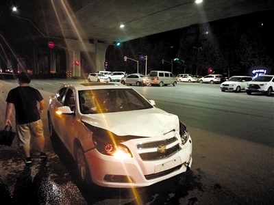 當(dāng)日凌晨1時(shí)10分,記者現(xiàn)場(chǎng)看到,南三環(huán)南半幅下橋口處,由西向東約30米的路面上布滿車身碎片,一輛白色雪佛蘭轎車??吭谧钣覀?cè)快車道上,車前臉已凸起,主副駕駛室的安全氣囊均已彈出,車輛仍處于啟動(dòng)狀態(tài)。
