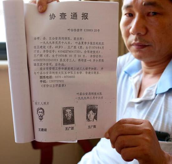8月21日,河南平頂山,遇害兒童王龍龍的父親王偉,向記者展示當(dāng)年葉縣警方發(fā)布的協(xié)查通報。從29歲追到47歲,王偉不僅要替兒守尸,還要漫無目的地追兇,任何線索也沒發(fā)現(xiàn)。當(dāng)初被警方通緝的4個嫌疑人,有3人已回鄉(xiāng)多年,因證據(jù)不足,他們已恢復(fù)自由。