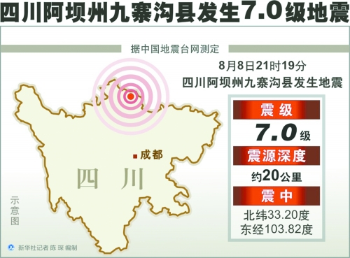 8月8日21時(shí)19分49秒,阿壩州九寨溝縣(東經(jīng)103.82度、北緯33.20度)發(fā)生7.0級(jí)地震,震源深度約20公里。