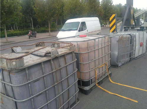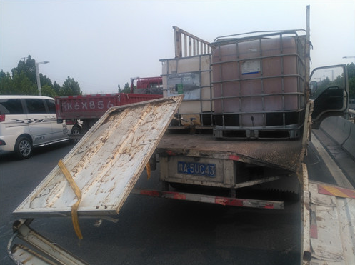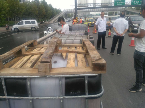 據(jù)貨車司機介紹,他車上拉的這些邊長約1米的方形大桶是裝醬油用的,當天拉著這些空桶從新鄭來到鄭州,因對路況不熟,不知道此處上橋口有3米的限高桿,直到上橋時撞上限高桿后,才知道貨車不讓上三環(huán)立交橋。