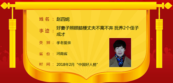 趙四妮出生在一個普通的農(nóng)村家庭里。窮人的孩子早當家,為了照顧臥病在床的父母,趙四妮毅然決定輟學,尋醫(yī)問藥,端茶倒水,榻前侍奉,她給父母以最周到的照顧和最貼心的安慰。然而,三年后父母還是因病情加重而相繼去世了。痛失雙親的趙四妮還未從痛苦中解脫出來,本來身體就不好的哥哥又患上了心腦血管疾病和糖尿病,病臥在床且雙目失明,她的嫂子撇下兩個年幼的孩子也離家出走了。從此趙四妮既要照顧起居難以自理的哥哥,又要撫養(yǎng)兩個年幼的侄子,幾個月后,重病纏身的哥哥也離開人世。后來,大侄子如愿上了大學,二侄子高中畢業(yè)后也參軍入伍,兩個侄子在自己的拉扯下總算熬出了頭,自己兒女學業(yè)也有所成,但趙四妮的丈夫楊自立患上了突發(fā)腦梗,生活不能自理。她不斷給丈夫笑容、信心和鼓勵,不分白晝黑夜端茶倒水,舒筋按摩,無微不至的照料使得丈夫能勉強下床行走。