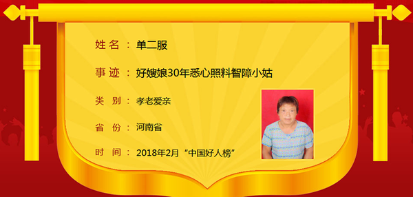大河網(wǎng)訊 3月4日,2018年2月“中國好人榜”發(fā)布,共有101位助人為樂、見義勇為、誠實守信、敬業(yè)奉獻、孝老愛親的身邊好人榮登該榜,河南省共有6位好人光榮上榜。他們分別是助人為樂好人:助殘扶殘20年的特教校長梁英。見義勇為好人:冬夜聯(lián)手相救落水老人的基層干部韓俊杰、李紅衛(wèi)。敬業(yè)奉獻好人:細心照料老人10余年的愛心男護理蔣禹成。孝老愛親好人:照顧腦梗丈夫不離不棄,撫養(yǎng)2個侄子成才的好妻子趙四妮;30年悉心照料智障小姑的好嫂娘單二服。