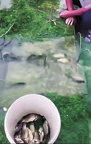 本次強降雨還導致固始縣境內的多條河流水位暴漲,河邊地勢較低的農田被淹沒。在固始縣城郊,一口水塘因為水位暴漲,水從塘埂一處低洼處溢出,水塘內大量鯽魚紛紛隨著水流準備出逃。村民發(fā)現(xiàn)后,在水流下方用網攔住魚兒去路,不一會兒就收獲一水桶鯽魚。