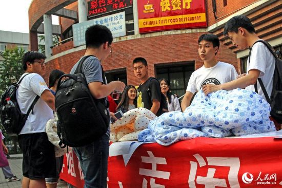 2015年05月31日,北京,清華大學(xué)大三學(xué)生小龍?jiān)谒奚針桥詳[起了攤位,一則“大量畢業(yè)學(xué)姐被褥”的廣告語(yǔ),引發(fā)大量學(xué)子圍觀。