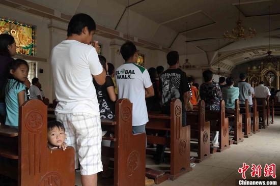 11月17日,菲律賓中部港口城市奧爾莫克大批民眾在當(dāng)?shù)匾蛔烫脜⒓訌浫觯瑢で缶裎拷?。中新社發(fā) 張明 攝