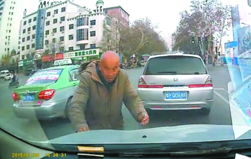 1月8日下午,鄭州市解放路立交橋西向東下橋口處,趙先生正停車待轉,看到一名身穿灰色棉襖的老人正向前方豫P牌照的本田商務車討錢。