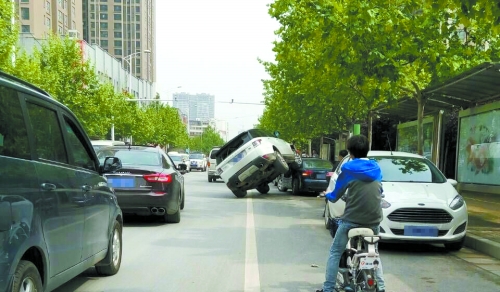 昨日上午10點(diǎn)20分,鄭州興華南街南三環(huán)公交站臺(tái)發(fā)生的一幕引起眾人圍觀:一輛路虎車(chē)“騎”在奧迪車(chē)上。