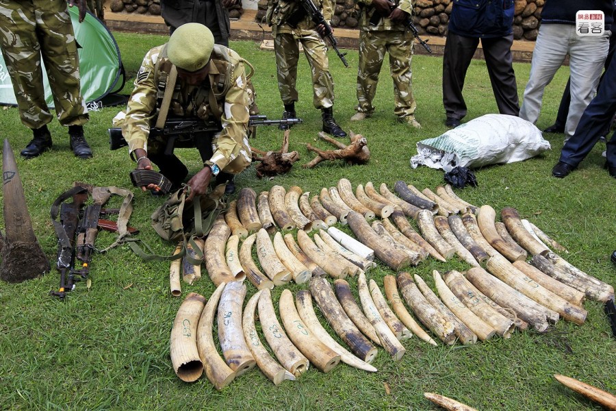 一根血跡未干的非洲象牙,一般由盜獵者通過南非、津巴布韋等國(guó)的非法象牙集散地,賣給非法象牙經(jīng)銷商。當(dāng)?shù)貢r(shí)間2013年1月6日,肯尼亞內(nèi)羅畢,肯尼亞野生動(dòng)物局官員繳獲一批走私象牙及偷獵者的非法槍支。REUTERS/Noor Khamis