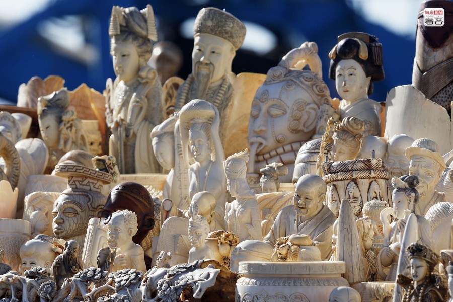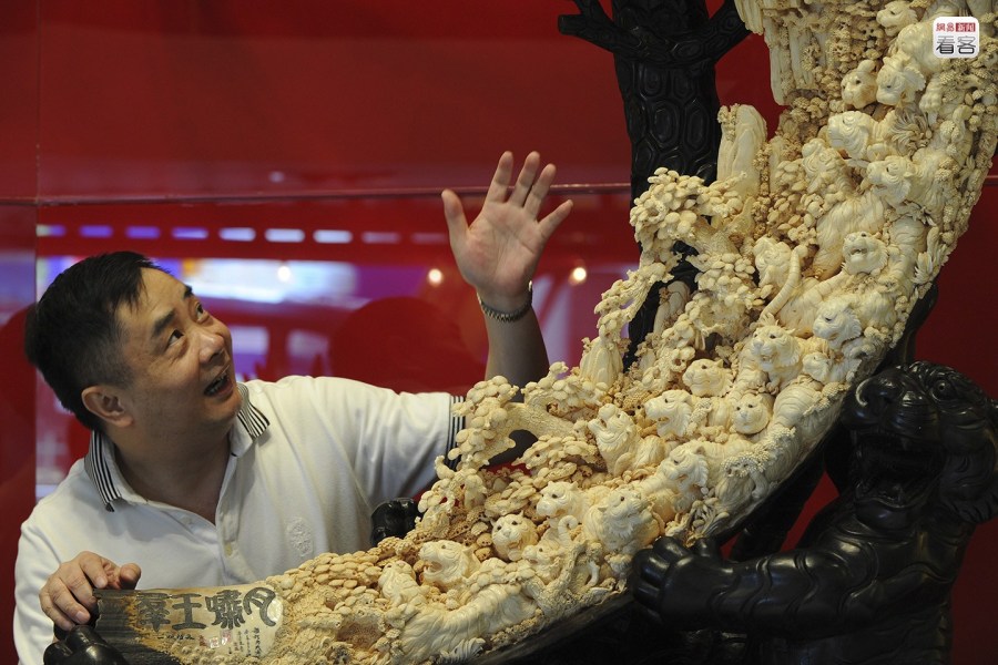 不斷上升的需求驅(qū)動(dòng)象牙價(jià)格的上漲,反過來增加了象牙作為資產(chǎn)以保值收藏的吸引力,使象牙的灰色市場(chǎng)不斷運(yùn)轉(zhuǎn)。圖為2012年4月6日,重慶,第五屆中國(guó)工藝品、禮品及家居飾品博覽會(huì)上,一件長(zhǎng)1.1米刻有《金剛經(jīng)》等80部經(jīng)文的象牙微雕作品被估價(jià)千萬元以上。CFP
