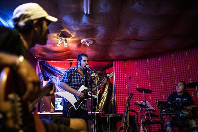 盡管照片中的人顯得很輕松,但對(duì)拍攝照片的Fatemi來(lái)說(shuō)卻十分不易。這個(gè)攝影師花了數(shù)月才被允許進(jìn)入女性健身房、發(fā)廊等。很多人不愿意被拍到臉,怕被認(rèn)出來(lái);很多人取消了預(yù)約,怕因此丟了工作。雖然存在著種種困難,F(xiàn)atemi還是取得了驚人的成果,為伊朗和外界拍攝了包羅萬(wàn)象的精美照片。圖為私人搖滾音樂(lè)會(huì)。搖滾音樂(lè)在這里是被禁止的,所以這類(lèi)表演一般都很隱秘的。
