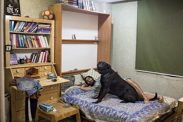 一名男性和他的狗在房?jī)?nèi)休息。狗在這里是不潔的,一般都不是寵物,而且由主人關(guān)在房間內(nèi)。
