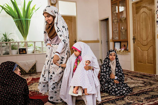 伊朗亞茲德中某家庭的女性成員,最小的女孩抱著一個(gè)娃娃,娃娃也帶著頭巾
