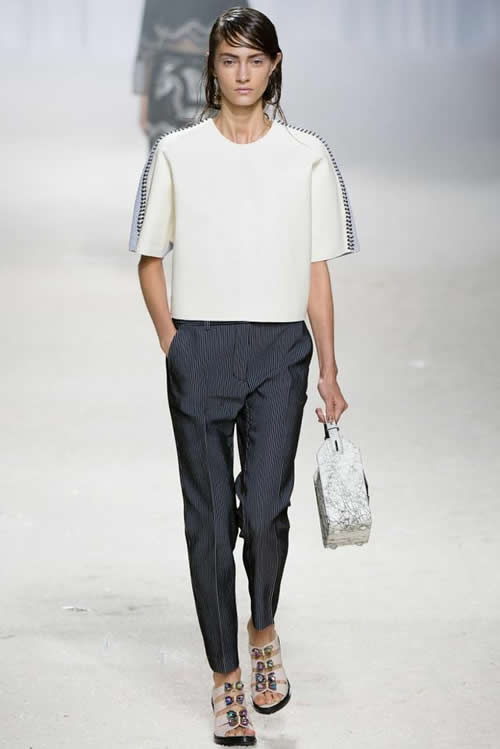 新一季,混搭主打清爽牌,針織拼接的廓型感套頭衫,配搭西裝款長褲,Boyish風呼之欲出。流彩寶石裝飾的涼鞋,悄然流露女人細節(jié)。