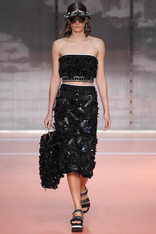 黑色立體花卉鋪滿抹胸上衣及鉛筆裙,黑色寶石渾然天成地灑落在花叢中,宛如暗夜里的點點星光,厚底拖鞋輕松地帶來一抹東方色彩。
