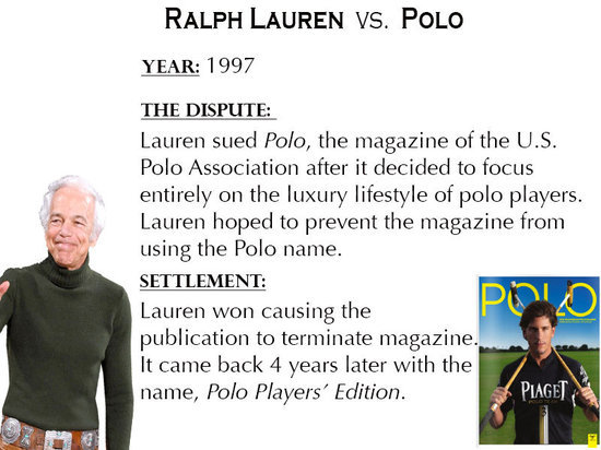 結(jié)果:Ralph Lauren贏得訴訟,但是美國馬球協(xié)會(huì)雜志在四年后用“Polo Players”的名稱開始生產(chǎn)馬球運(yùn)動(dòng)配件