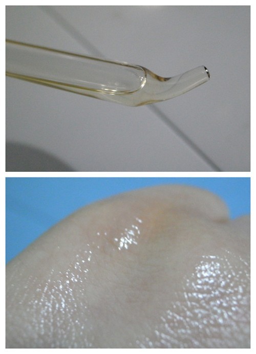 肌膚清潔之后,開始使用彼得羅夫維他命A晚間滋養(yǎng)精華液。PTR小藍(lán)瓶是水狀油質(zhì)的透明無味液體,滴在手背上極易擴(kuò)散,說明它的流動性很強(qiáng)。稍加按摩,精華液便被完全吸收,滋潤但不黏膩,讓肌膚很有好感。