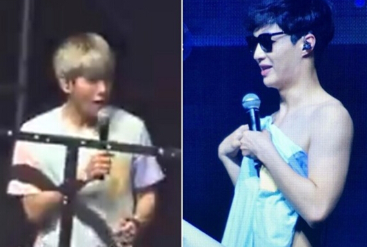 EXO在澳門演唱會上玩起現(xiàn)場換衣的橋段,成員頭部以下僅用白紙搭成的幕遮著,在燈光變換下可以看到團(tuán)員脫衣的剪影,讓歌迷看得心癢癢,不料,當(dāng)歌曲進(jìn)行到一半,正在更衣的成員還跟著音樂擺動,紙幕就突然掉落,每個人都嚇得不知所措,已換好衣服的伯賢在一旁趕緊把紙拉起來,想擋住在一旁脫光的燦烈,沒想到越幫越忙,紙幕整個被撕開,工作人員只好也沖出來幫忙扶起布幕,場面爆笑又養(yǎng)眼,意外成為當(dāng)晚表演最大亮點。