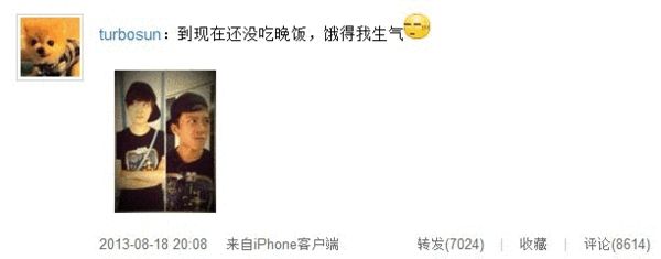 8月18日20點08分,孫儷通過微博曬和鄧超同傳情侶裝的照片,并稱:“到現(xiàn)在還沒吃晚飯,餓得我生氣!”照片中,兩人身穿黑色T恤情侶裝,很默契的把鴨舌帽的帽檐戴在后面,夫妻二人都歪眼斜視,橫眉冷對,看上去似有仇一樣。