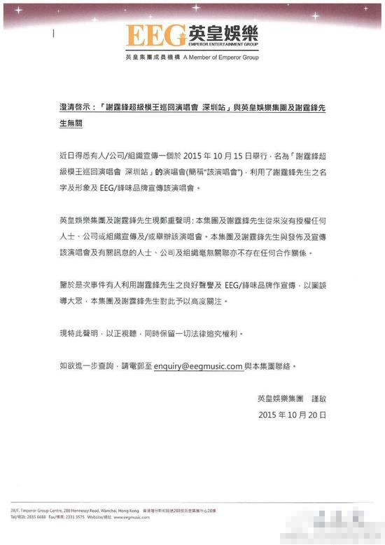 謝霆鋒經(jīng)紀(jì)人霍汶希表示“本集團(tuán)及謝霆鋒先生從來(lái)沒(méi)有授權(quán)任何人士、公司或組織宣傳或舉辦該演唱會(huì)。本集團(tuán)及謝霆鋒先生于發(fā)布及宣傳該演唱會(huì)及有關(guān)訊息的人士、公司及組織毫無(wú)關(guān)系,不存在任何合作關(guān)系?!币悦夥劢z受騙,同時(shí)保留一切法律追究權(quán)利。