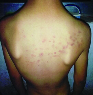 10月8日,謝女士在給小韋洗澡時(shí),發(fā)現(xiàn)孩子的后背上都是紅斑,像是被什么硬東西戳傷的。從謝女士提供的照片可以看到,小韋的后背上是成片的紅斑,記者粗略地?cái)?shù)了一下,紅斑超過(guò)50個(gè)?!爱?dāng)時(shí)我問(wèn)他是怎么搞的,孩子也不說(shuō),我以為是在學(xué)校玩摔倒弄的,就沒(méi)再追問(wèn)?!?/p>